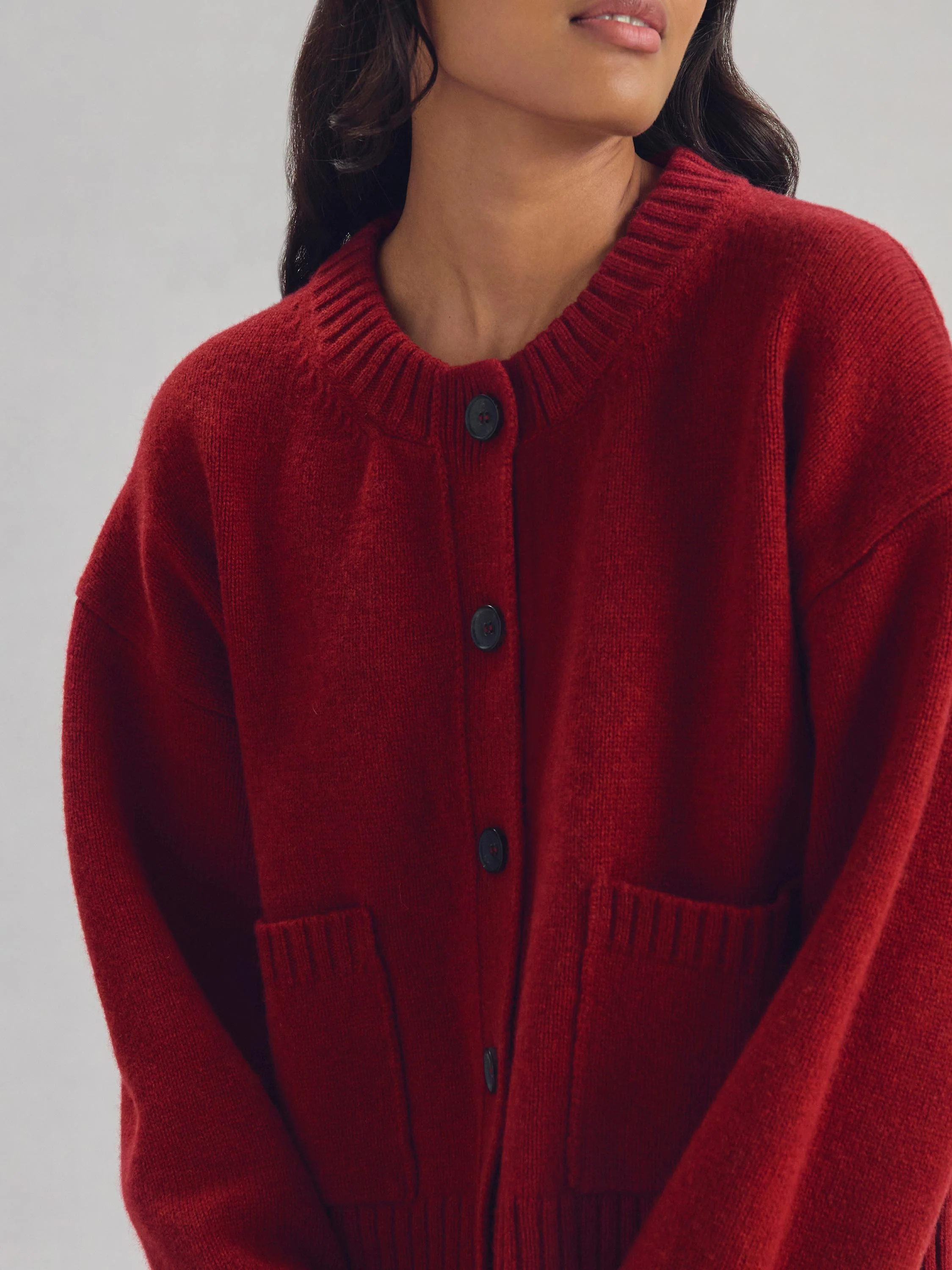 The ultimate layering piece for chilly days, this Red Crew Neck Wool Cardigan is a cosy classic you’ll reach for time and again. Designed with a relaxed, slightly cropped fit, it features a round neckline, ribbed trims, dropped shoulders and two patch pockets at the front. Wear it over pyjamas for laid-back mornings at home, or style with your favourite trousers for the perfect everyday look.